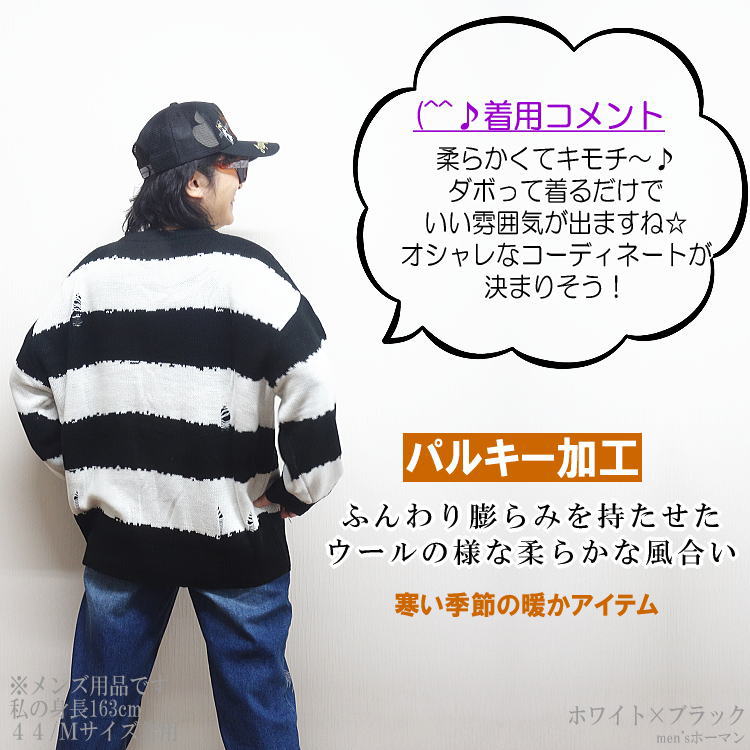 ボーダー柄のニットにスカルアップリケ刺繍の個性あふれるデザイン。