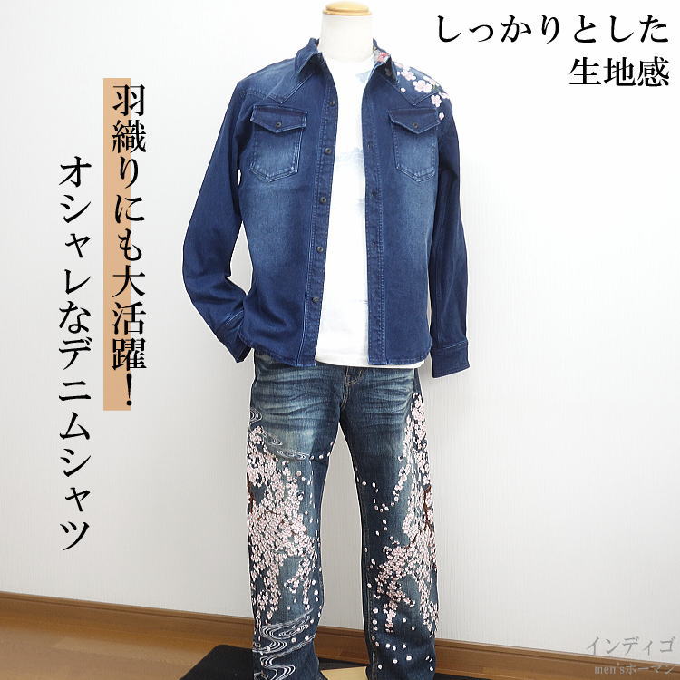和の雰囲気満載のコーディネートしやすい和柄ウエスタンデニムシャツ。