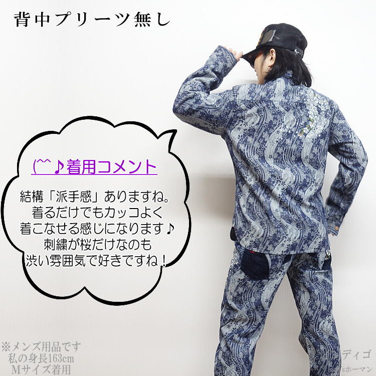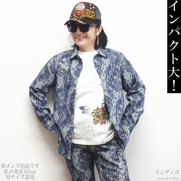 ▼絡繰魂新作!デニムジャガード織桜刺繍長袖シャツインディゴ!