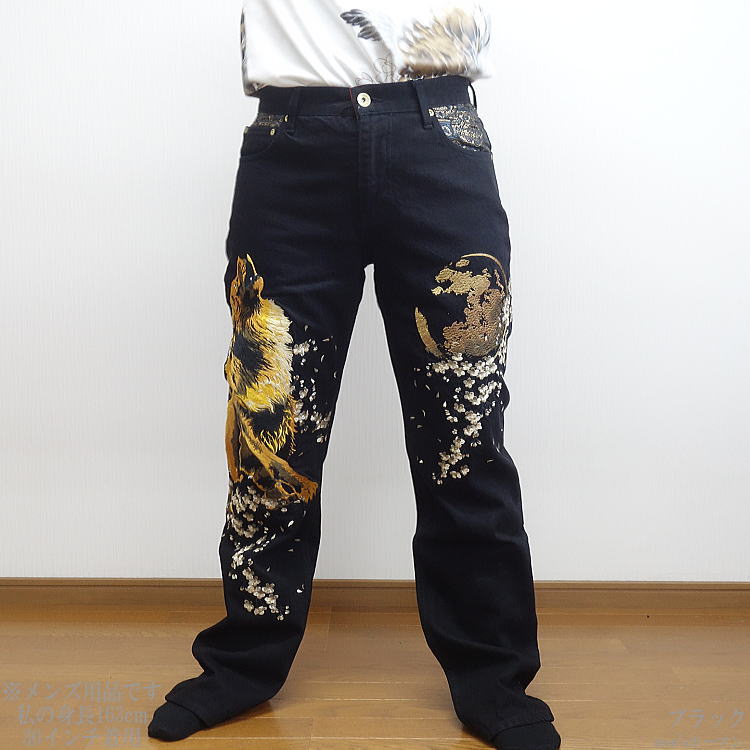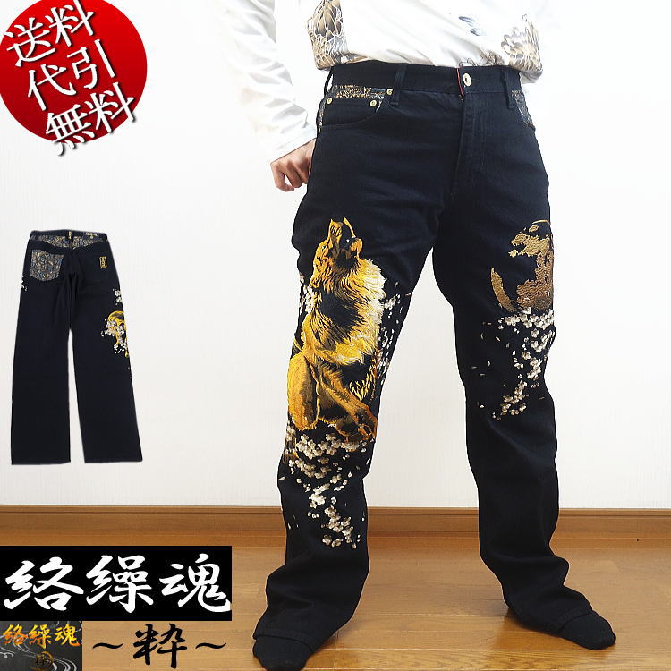 絡繰魂~粋~最新作★男らしい狼刺繍のブラックジーンズ!261250